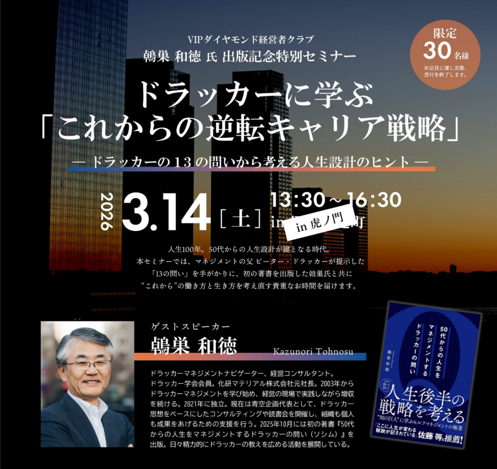 本セミナーでは、元・化研マテリアル株式会社社長を務め、経営現場でドラッカーを実践し増収を続けてきたリアル経営者であり、ドラッカーマネジメントナビゲーターの鵫巣和徳氏をゲストスピーカーにお迎えします。